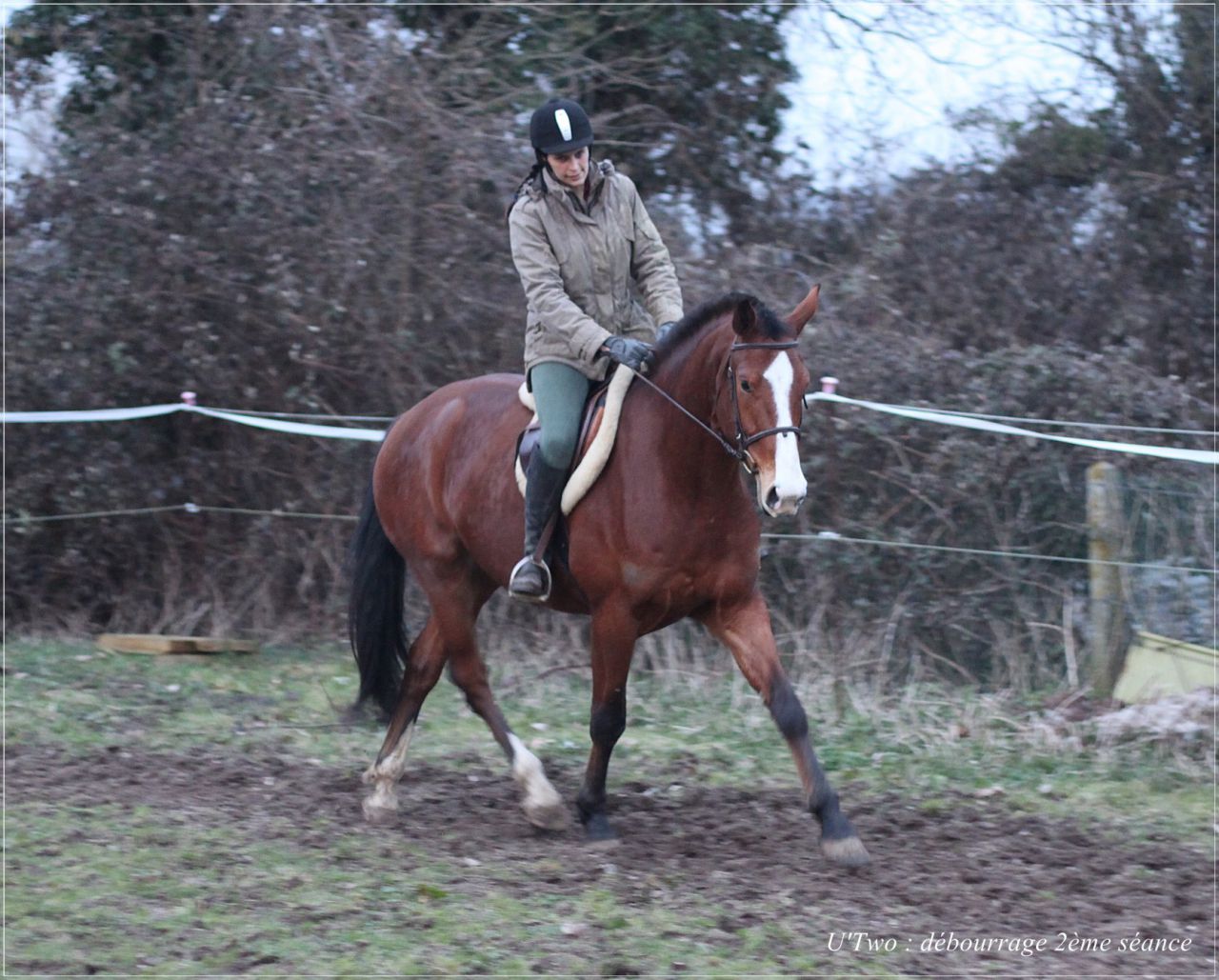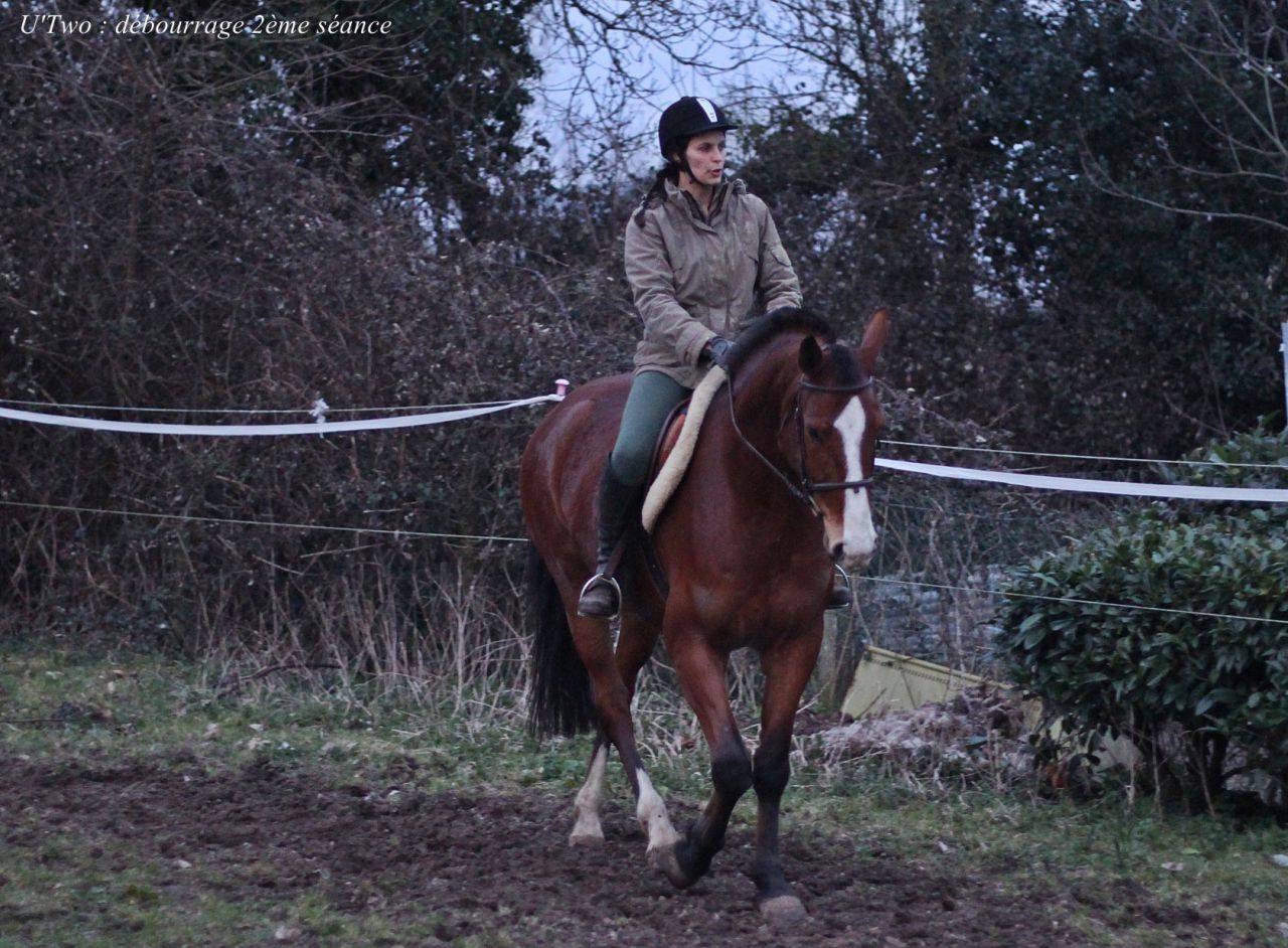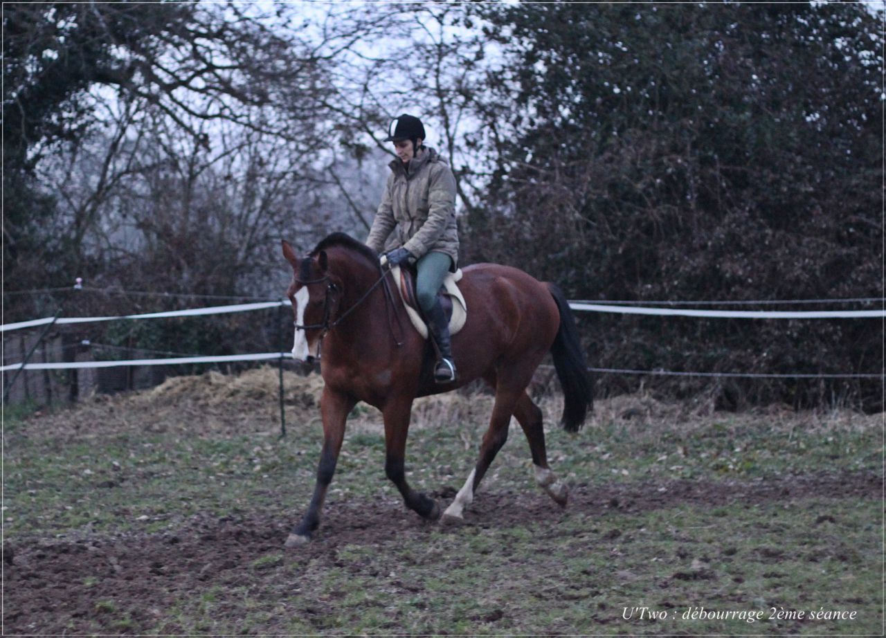 Bon ça y'est c'est officiel j'ai commencé le débourrage de mon U hier !!!!! Après 2semaines de travail à pied après 2mois de repos complet à glander hier je me suis lancée non sans appréhension car M. est un brin foufou ... et ça a été ! ! J'ai fait mes premiers pas de trot, bon il est pas super en avant, plutôt hésitant et s'arrête souvent MAIS il est hyper confortable , il à un chouette trot très agréable et se pose naturellement sur son mors ! !