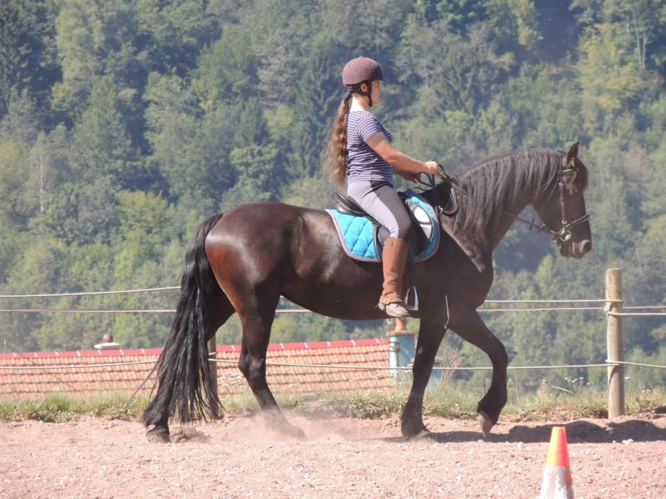 | Dire merci | merci de l'accueil. Ce n'est pas un si grand gabarit: 1m62, mais la photo est prise de telle façon, qu'on le dirait. Je suis en région parisienne, et l'herbe n'est pas celui de son pré. Juste un terrain vague de la commune, où j'a la bosse, parce que justement il est bien! Udie est une TF réformée, elle était debourrée à l'attelage mais pas à la selle quand je l'ai acheté en septembre. Elle est juste incroyable! Son débourrage a été très rapide... Je peux partir seule ou accompagnée en balade, elle aura toujours envie de se balader. Elle est hyper câline, et elle est déjà attachée à moi. |