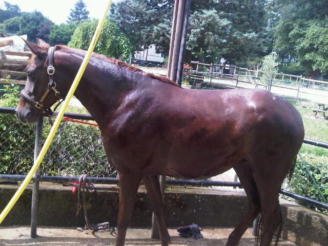 | Dire merci | Pour nous, aujourd'hui avec la chaleur, les taons, les mouches, sa a etait repos... Ullie transpirer a ne rien faire tellement elle avait chaud !! Ducoup...douche...sa lui a fait un bien fou !!! Apres, une bonne roulade dans la terre...et hop, une jument alezane devient grise Par contre, niveau insectes...je ne sais plus quoi faire... j'ai essayer tout les produit du commerce possible, et je trouve qu'aucun n'est vraiment efficace...au bout de cinq minutes, ces sales betes reviennes l'attaquer, vous n'auriez pas des idees d'autres chose, des recettes maison pour repousser les insectes ??? A part sa, je suis en vacances pour deux semaines, a partir de vendredi..donc on vas pouvoir travailler etant donner que le champ d'a coter est faucher !!! Auriez vous des idees pour que je lui remuscle un peu le dos ?? Vu que c'est dernier temps je n'est pas eu vraiment de temps...madmoiselle se demuscle assez vite.. |