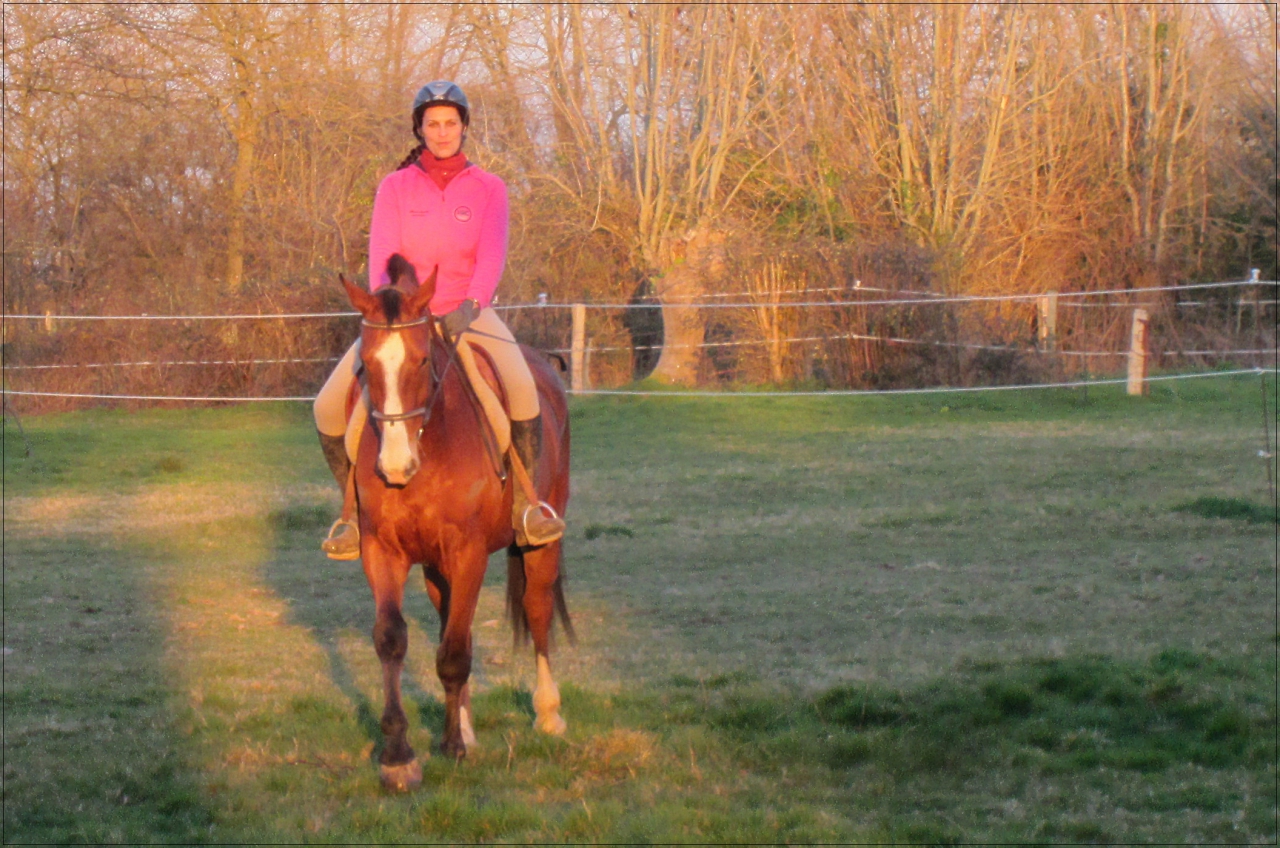 | Dire merci | c'est que ça coûte ces grosses bêtes faut pas compter, sinon tu pleures ttropchoutoi, tu l'auras ta selle... et puis c'est un investissement ! Cet après midi j'ai chargé ma blonde en van et zou on est partie voir une copine, on est sortie en balade légèrement plus long que prévu cause chemins innondés, on a fait des détours... Umina n'a pas chauffé au départ, une bonne chose vous allez me dire, sauf que moi en bonne parano je me disais ça y est, c'est qu'elle est pas bien etc etc .... Finalement rythme cool, pas de gros dénivelés, elle a avalé les 18km sans soucis, et s'est permis le luxe de faire l'andouille en coup de cul galop sur place en fin de balade car rester derrière le cheval de ma copine au petit trot ça lui plaisait pas... A suivre |