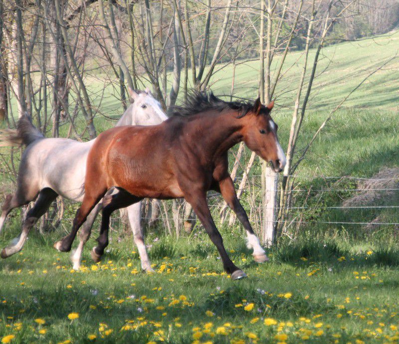 | Dire merci | Ca va bien se passer il n'y a pas de raison.![]() Alors hier Ukaï s'est pris un coup de pied de Vaïna sur la cuisse, rien de trop grave, mais il m'a bien fait sa tête de victime, quand je suis venue mettre le foin il ne voulait pas y aller et voulait des câlins. Enfin bon ce matin mise au prés d'été, et là il avait la pêche il a sauté dans tous les sens, et de bonnes galopades Je suis heureuse de voir mes chevaux dans autant d'espace, j'ai enfin réussi à offrir la vie que je voulais à mes chevaux. |