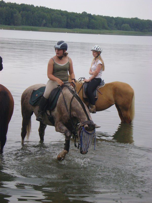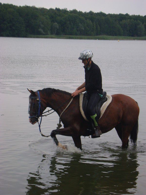 | Dire merci | et moi de retour de rando sur mes terres : 1er jour 43km, 2eme jour 27km. et découverte du lac pour nella. ![]() Nabil lui connaissait ![]() elle qui n'aime pas l'eau ( comme son frère d'ailleurs) elle est rentrée facilement. Mais bon les 4 autres chevaux y sont allés alors elle a suivit. |