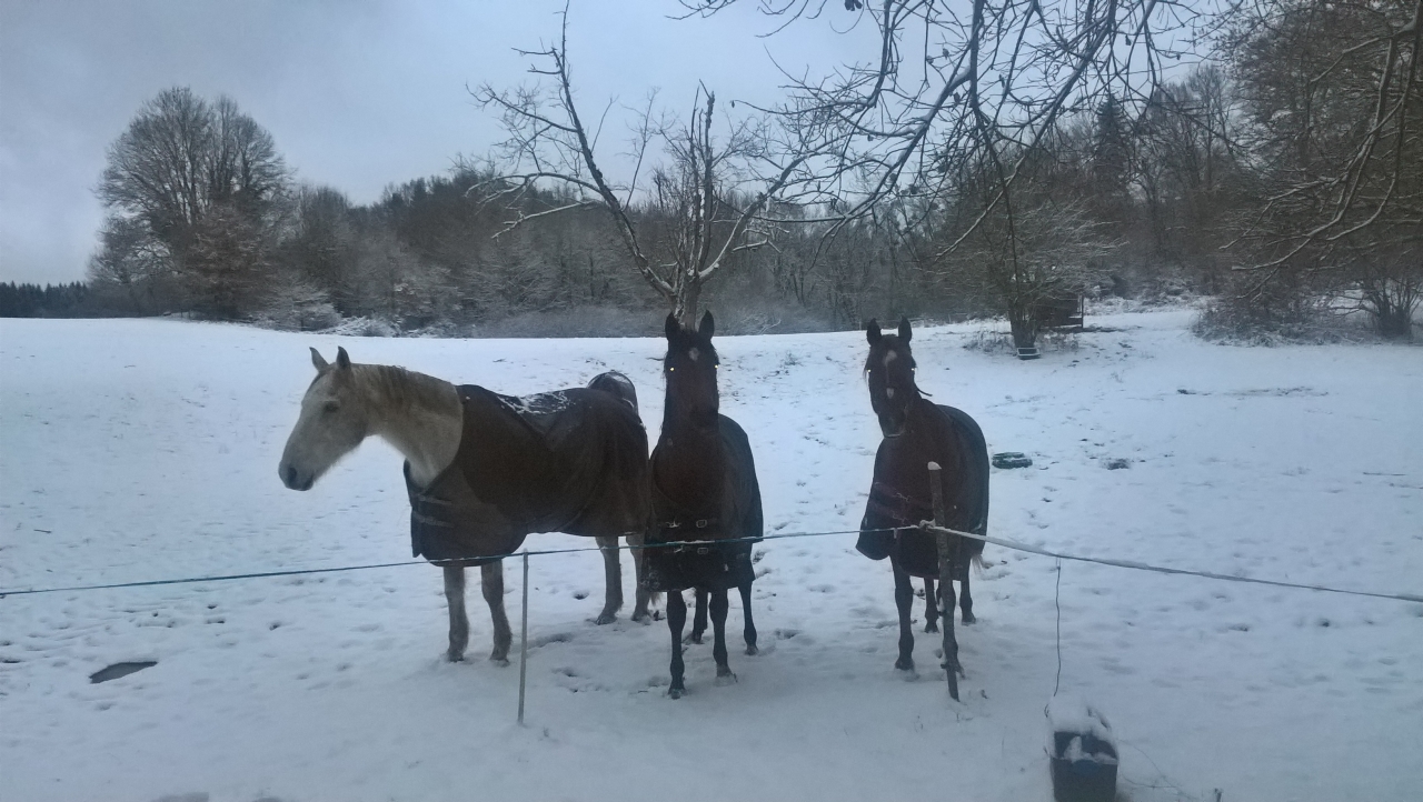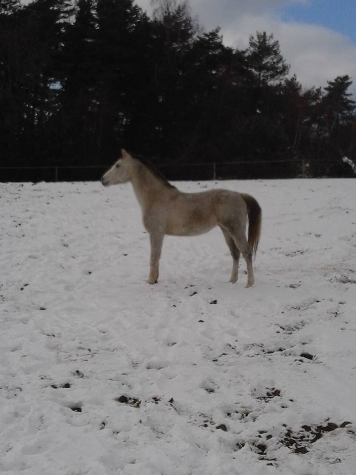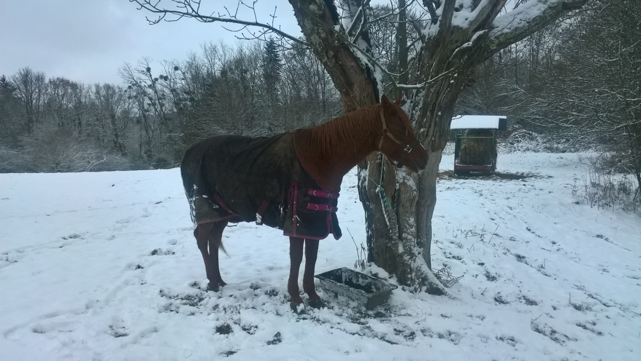 | Dire merci | Diego est à la maison ! il doit déprimer de se retrouver à nouveau seul ....... Un bon point pour en acheter un autre et qu'il est enfin un pote de pré fidèle et stable. Bonne balade de 1h30 dans la neige. Et bien adorable du début à la fin, des bons galops ..... Un ange! Weekend pro je tente ma 1ere balade seule avec lui du coup .... et demain essai de la pouliche ! |
