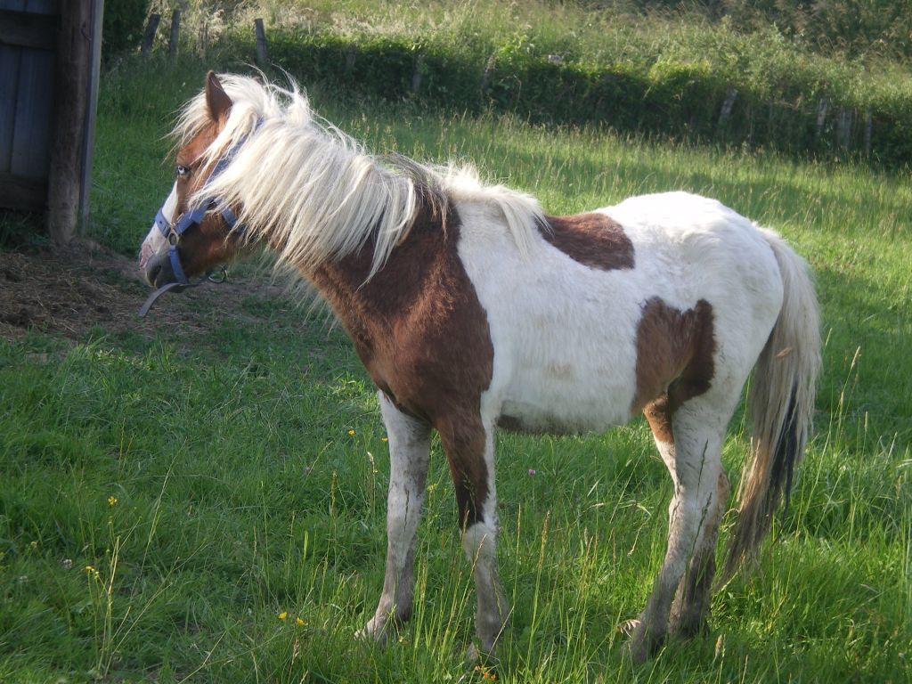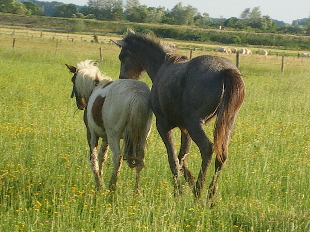 | Dire merci | coucou voilà c'est fait depuis aujourd'hui, Utwo a changé de pré et a un copain du même age que lui mais un poney ! Je le garde pendant un an, c'est quelqu'un du coin qui me le prête... Je l'ai baptisé Undien bon c'est pas la bonne orthographe mais le ptit sans papiers est pie alezan, très farouche, J'ai mis un bout de temps pour le prendre en licol et le toucher, il est vraiment peureux, enfin il ne connait pas l'homme. Un boulot que je n'ai pas eu a faire avec Utwo D'ailleurs il parait immense a coté ! Ah oui j'allais oubier Undien a les deux yeux bleus l'est chou !!! Un peu maigrichon mais bon Des phots demain... Kat ca approche !!!!!!!! |