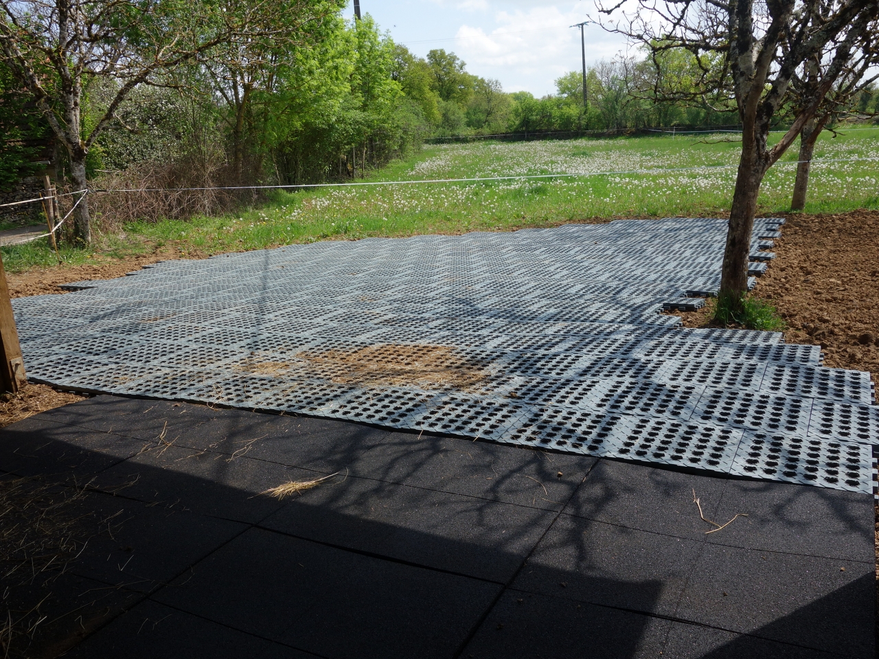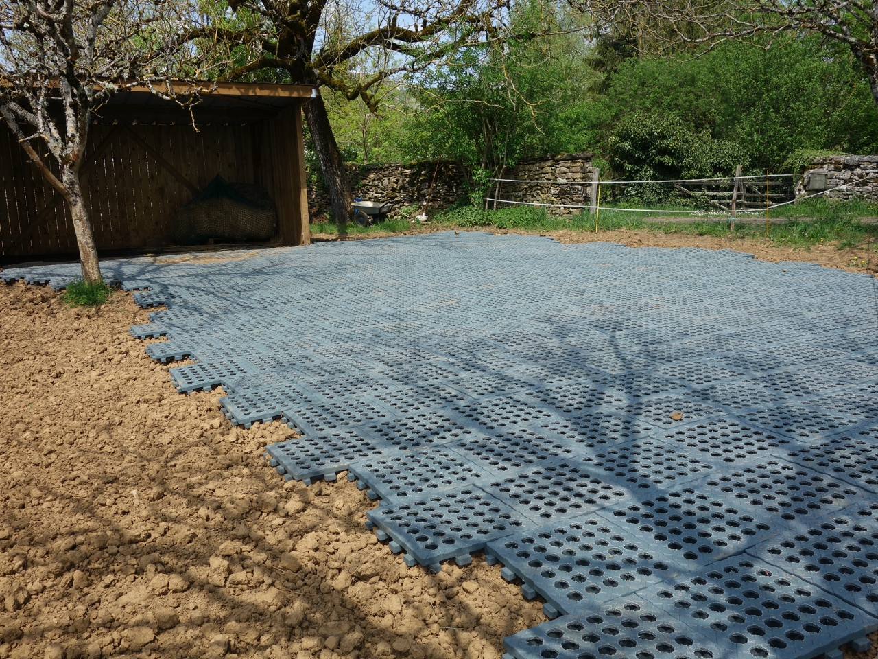 | Dire merci | soanne ça tient dans le temps?tu decaisses et met geotextile en dessous? Ça ne fait pas des creux avec le pietinemment des chevaux? Il faut que je regarde pour un devis... J'ai quand même demandé un devis pour les dalles sagustu au cas où. Ceux qui en ont installé toujours contents? Si je pars là dessus j'envisage de ne pas faire un gros travail de préparation du terrain, mais comme il est très irrégulier et un peu trop bas par rapport aux box, de le faire quand même rencaisser et aplanir/compacter avant de poser les dalles moi même. oziris tu as trouvé un moyen de caler tes salles? |