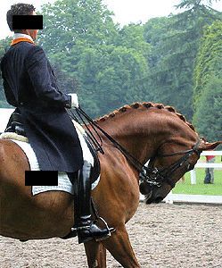 Dire merci | c'est une interprétation exacerbée du "bas et rond". D'un cheval bas et rond à la détente, donc plutôt avec une encolure horizontale voire basse (type extension d'encolure) mais toujours avec le chanfrein à la verticale, on est passé à cette mode d'hyperflexion qui encapuchonne le cheval pour développer une musculature de l'encolure et du crawl des antérieurs, exprès poru plaire aux juges de dressages qui aiment le jeté de papattes et ne regardent même plus si le cheval engage correct ou se trimballe comme un lapin à toulettes. |