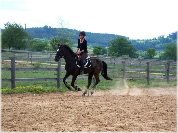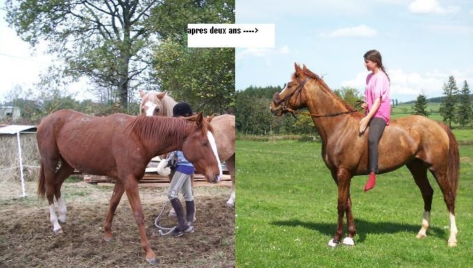 | Dire merci | jai aussi une troteuse réformée de 4 ans. Elle a fait 6mois d'entrainement puis ils l'ont envoyer a la boucherie.... Je l'ai récupéré, faite débourrer pour la selle au mois de octobre/décembre 2007. Débourrage trés difficile au debut car jument traumatisé par l'homme ... Maintenant jument adorable, malgré son fort caractére et une indépendance évidente. Au travail, moi la carriere ça lui pause aucun souci. Au trot elle n'a plus son trot de troteur, mais a des difficulté a resté totalement immobile une fois que le travail a bien commencé. Donc en faite comme beaucoup de réformé, il faut leur redonné confiance en l'etre humain, etre trés patient avec eux et les aimer coute que coute Si tu as d'autre question n'hésite pas ![]() |