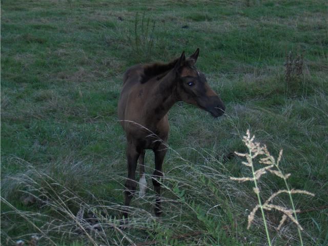fin juin je suis allé la voir et elle etait alezan, hier soir sa proprio m'envoi un mail pour me donner des nouvelles de la pouliche et elle m'envoi une photo elle a bien changé quelques indications sur la pouliche : c est une SF papa gris maman bai (la photo a été prise à la tombé de la nuit) alors voilà je me demande de quelle couleur va-t-elle être ?