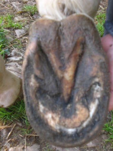 | Dire merci | Juste une petite photo pour faire sauter au plafond les proprios de chevaux pieds nus qui parent un peu et les autres qui parent aussi : Ce sont les pieds d'un cheval agé censé être paré toutes les 8 semaines et tenez vous bien, sur cette photo, vous voyez un pied paré il y a 2 jours. .. Bref.. quand j'ai vu ça, j'ai dit à sa proprio de ne pas payer la facture et de changer de maréchal. Y a des trucs quand même inadmissible, même si on fait pas du parage physio... |