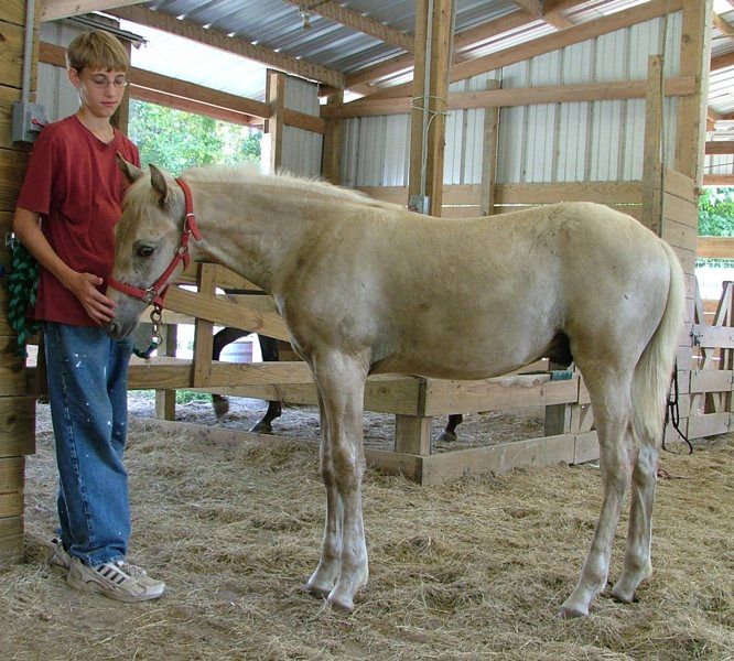 | Dire merci | oui je suis tombée amoureuse de cette race, et comme je voulais un cheval pas compliqué (assez de soucis avec mon loulou lusi, entier gentil mais imprévisible), j'ai choisi ces chevaux. j'ai une autre RMHA une pouliche de 2 ans et demi, et voilà je voulais acheter 1 seul , et me voilà avec un autre, je suis tombée amoureuse de sa bouille, (et aussi du père) et me voilà avec 2 rockys, lui n'arriverà qu'en 2009/10, d'ici la je le regarde en photo seulement. concernant la couleur effectivement il ne resterà pas clair, mais bien choco + où - foncé, mais son père et mère sont bien foncés crins clairs. |