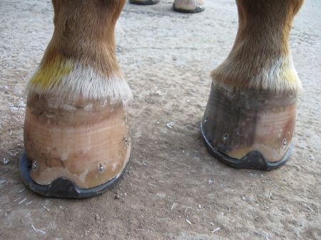 | Dire merci | Voilà le résultat, ferrure posée avec 4 clous par fer aux antérieurs (en mettre davantage du côté sain aurait créé un déséquilibre...)![]() ![]() ![]() |