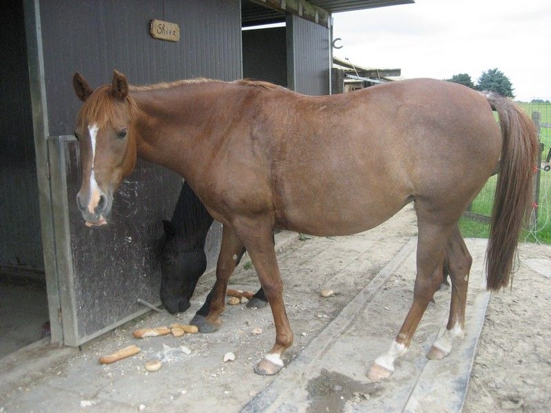 | Dire merci | SDE : ben parce que, ma jument est trop grosse, mais elle maigri l'hiver, et vu comme elle travaille tres peu si je lui sens les cote c'est qu'elle serai trop maigre, elle a son poid de croisiere et jamais je ne lui ferai faire un regime, car d'une ca ne servirai a rien qu'a lui foutre le moral en vrac et de deux elle regagnerai tout directement en fin juillet avec son poid normal, je la trouve un peu trop grasse, mais sans plus, du moment qu'elle garde pas son gras toute l'année ca me va ![]() pour mon poulain regarde cette photo : on ne lui sens pas les cote et pourtant je le trouve pas rempli, creux au niveau des hanches etc... alors je le complemente plus ![]() la il etait bien : ![]() je pense que le fait qu'on puisse sentir les cote c'est plutot pour les chevaux qui travaillent bcp. |