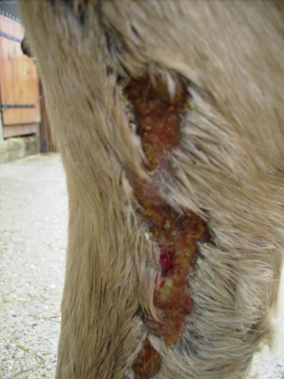 | Dire merci | miracle est tombé samedi dernier il a glissé sur la dalle devant les box et son posterieur a glissé (le long de la barrière a droite sur la photo), et a fait une chute de la hauteur de 3 agglos (60 cm) [url=https://www.1cheval.com/membre/services/photos/images/26343.jpg] ![]() [/url] voila le resultat, apres 6 jours [url=https://www.1cheval.com/membre/services/photos/images/28185.jpg] ![]() [/url] [url=https://www.1cheval.com/membre/services/photos/images/28186.jpg] ![]() [/url] [url=https://www.1cheval.com/membre/services/photos/images/28187.jpg] ![]() [/url] c'est moche non ? il a eu 2 jours d'antibio tout de suite et un anti inflammatoire tout de suite egalement. le véto m'a dit de desinfecter a l'eau oxygenée et de mettre une pommade antiseptique cicatrisante (tifene) et voila, depuis hier, c'est chaud, bref ca s'infecte, je suis passée chez le veto qui m'a redonné des antibiotiques pour 5 jours, j'ai laissé tomber la pommade et l'eau oxygenée, et je lui fait des pansements imbibés de betadine, c'est tout qu'en pensez vous ? merci |