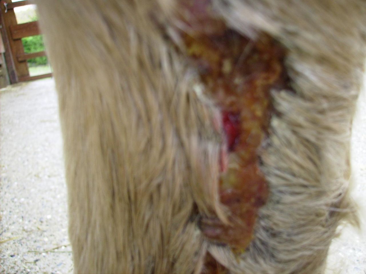 | Dire merci | je conseillerai rinçage a l'eau tiede avec vetedine savon sechage puis betedine solution une fois que bien impregné je mettrai de l'aluminium en spray a faire une a deux fois par jours je ne le mettrai pas ay pre surtout si gadoue mais plutot je le marcherai en main 1 demi heure deux fois par jour foin a volonte et barbotage pour le transit |