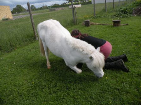 | Dire merci | moi j'en ai repris un depuis 1semaine. j'en avais un entier de 4ans, poly, quand je l'ai eu il était sauvage et pas comode... j'ai mis 6 mois pour arriver a en faire un gentil poney sociable montable par des enfants en ballade et en carrière au milieu des autres + obstacle. puis j'ai eu un accident et j'ai du le vendre pour assumer financièrement. je l'ai fait castrer il était trop beau ce petit mec!! maintenant il est dans un club... ![]() donc j'ai pas pu m'enpecher, j'en ai repris un, il est pie, entier, 7ans, il n'est pas débourré, il mord et il tape ca fait une semaine que je l'ai il a compris qu'il fallait pas tourner les fesse pour accueillir et il évite de mordre ![]() je ferai des photos |
