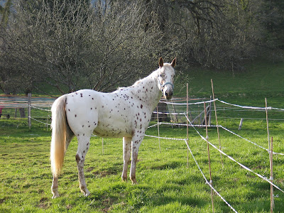 Dire merci | Voilà j'ai modifié. J'adore les appaloos, vraiment, même si côté santé on a plutôt plus de m** que ce qu'on a pu avoir avec des chevaux "croisés porte et fenêtre"... Celui là est une crème de cheval, même s'il est moins flashy!! |
