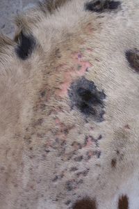 | Dire merci | la mule d'une amie véto a la teigne et bien je peux te dire qu'elle se gratte je lui mettais une creme pour eviter quelle s'infecte. sa commensait comme la photo et a force de se gratter elle saignait mais je me trompe peut etre je continue a faire des recherches |