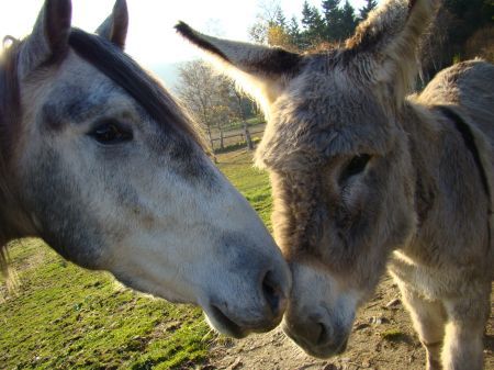| Dire merci | j'ai une anesse, elle s'entend hyper bien avec tous mes chevaux, qu'ils soient en groupe ou pas ils sont loin de l'ignorer. Maintenant elle est en couple avec ma jument de 18 ans pétée de sang, elles s'entendent à merveille |