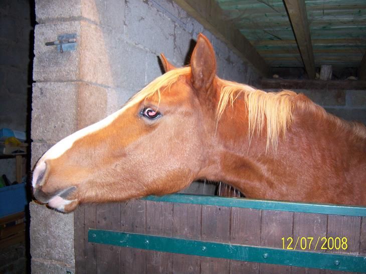 , alors que mon cheval a toujours vécu en troupeau jusqu'à ses 3 ans. Mais bon... tant pis ! Il a 7 voisins directs, donc il est loin d'être seul ! Et l'essentiel est qu'il puisse vivre une vie comme les autres chevaux en pouvant aller au pré. Mais je ne perds pas espoir de lui trouver un gentil pote ! Mais ce sont les proprios des hongres qui ne veulent pas, alors que mon cheval a plus de chance d'être blessé que les leurs (il est plus petit et déferré).