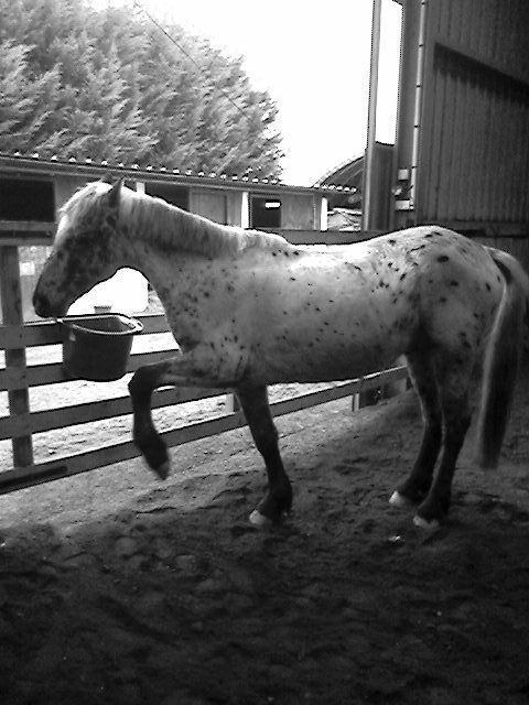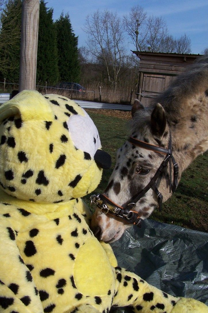 | Dire merci | moi j'ai la solution!!! avoir un poney qui N'A PAS à la base les crins blanc... je rigole pas, Quezzac est bien léopard, mais je pense sur une base baie et dont les crins sont gris/blanc/choco/blonds, bref, naturellement ils sont couleur sale, donc pas le choix (et pas de pb non plus!). bon c'était cet été, en hiver, il a le poil plus foncé encore, donc ça cache mieux la crasse: ![]() ça ne l'empêche pas d'en ajouter une couche pour bien faire la différence d'avec un poney VRAIMENT crasseux!: ![]() |