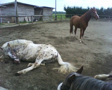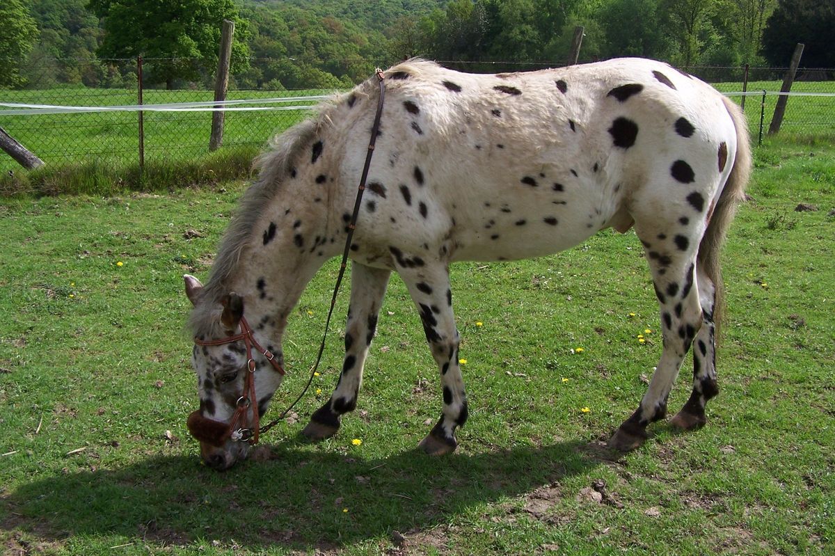 Déconnecté | complément de définition : "le léopard : robe toute blanche (cape maximale ! ) parsemée de taches sombres qui correspondent à la robe de base." "Robe tachetée, "robe appaloosa" : terme qui regroupe plusieurs patrons de robes, tous produits par un ensemble de gènes appelé "complexe léopard". Ces robes se rencontrent dans plusieurs races à travers le monde : Knabstrup, Noriker, Altaï, Barbe, Appaloosa, etc. Par abus de langage on dit souvent "robes Appaloosa" ; mais l'Appaloosa est une race américaine de création relativement récente, et les robes tachetées, qui semblent avoir existé déjà à l'époque préhistorique (peintures murales), ne se limitent absolument pas à la race Appaloosa puisque cette robe semble bien avoir été introduite sur le continent américain par les chevaux espagnols et barbes des conquistadors à partir du 16e siècle." ça fait pas de mal un peu de théorie ![]() |