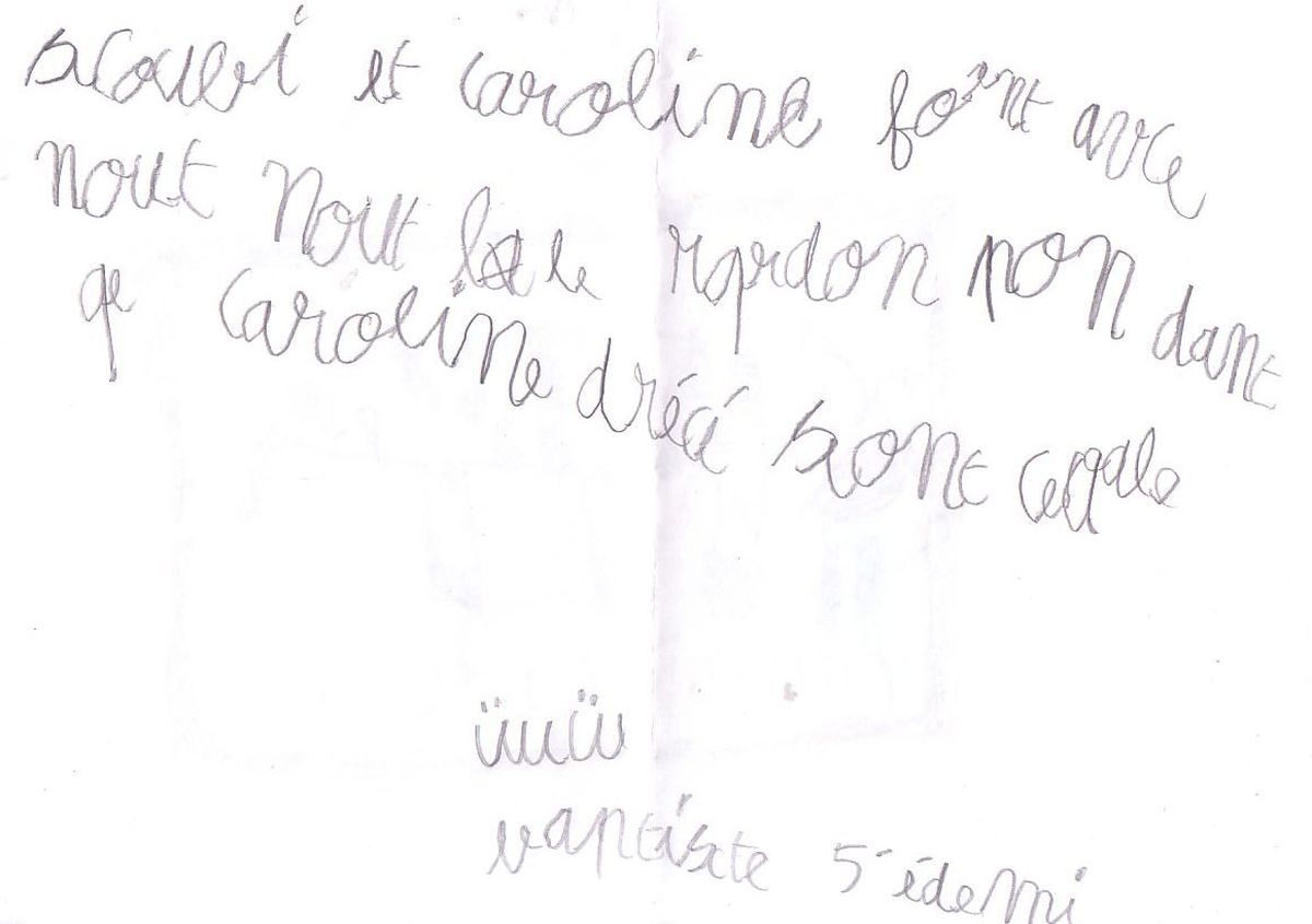 Déconnecté | Et voilà le dessin de mon neveu 5 ans (Scoubi et Caroline dans le pré : il a trois pattes mais c'est parce qu'il marche lol voilà la réponse du ti neveu Je trouve ça trop mimi alors envie de partager!!! [url=https://www.1cheval.com/membre/services/photos/images/38287.jpg] ![]() ![]() [/url] Et le texte qui accompagne (avec traduction lol) : Scoubi et Caroline font avec nous, nous le regardons pendant que Caroline dresse son cheval |