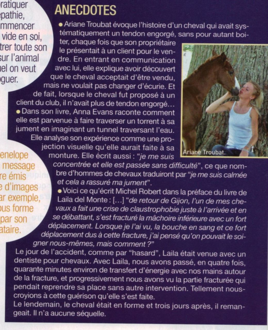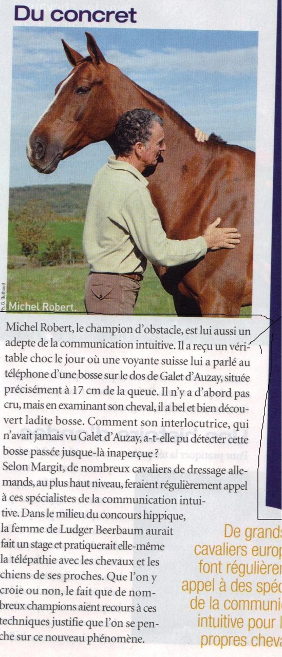 | Dire merci | renseignez vous avant de faire les "juda"(je crois se que je vois) les plus grands cavaliers comme: -margit Otto-crepin(championne d'europe et vice championne olympique)ET femme d'affaire plutot rationnelle donc la tête sur les épaules plus, -michel Robert Tous sont adepteS de cette NOUVELLE pratique si franck y crois et que sa peut l'aider dans sa tristesse et BIEN POURQUOI PAS moi j'ai essayer alors je sais de quoi je parle et je ne carbure pas au cactus allucinogénes |
