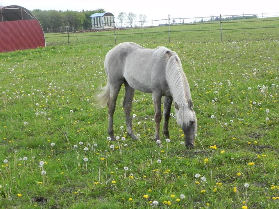 | Dire merci | Thypie est Isabelle sur le Sire par ce qu'elle a le gêne DUN Elle est donc "Red Dun" ![]() Sur cette photo on ne voit pas sa raie de mulet mais on distingue les zébrures au dessus des balzanes . |