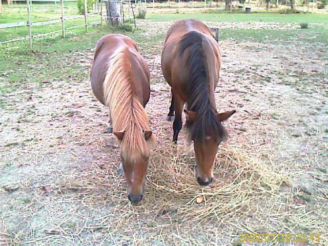 | Pour ceux qui ne me connaissent pas, j'ai acheté une mini shetland au mois de juin dernier. Elle est chez moi avec 2 moutons dans le box. Il y a aussi 3 autres chevaux.Cet hiver, tous le monde disait qu'elle était trop grosse et qu'elle risquait une fourbure... Je l'ai donc mise au régime. La semaine dernière, en la caressant, je me suis aperçu qu'elle était assez maigre en dessous de son poil de 10 cm de long. Mais c'est pas facile à voir avec cette fourrure! Samedi, surprise! boom, boom, son ventre bouge!!! un coup de patte par ci, un coup de patte par là!!! eh oui, ma petite noisette est pleine et attend un poulain! Je ne le savais pas et l'ancienne proprio de me l'avais pas dit! Je ne sais même pas avec quel étalon elle a été saillie!! la seule chose que je sais c'est qu'elle a un poulain dans le ventre et que je ne sais pas quand elle va pouliner!!! Pauvre petite noisette qui était encore montée la semaine dernière, les moutons la chahutait dans tous les sens... Je m'en veux de ne pas l'avoir vu plus tôt. Mais aujourd'hui, promis je m'occuperais bien de la future maman: un grand box pour elle toute seule, double ration et plein de paille. Je vous mettrez prochainement les photos du poulain! |