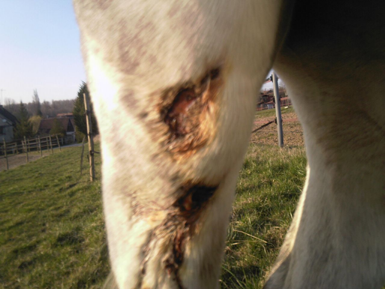 | Dire merci | plein de zondes pour toi... Ma jument a chuté mercredi dernier ( soit il y a 9jours) J'ai l'impression que je ne verrais pas le bout elle a 5plaies sur le coté gauche ( chute au galop sur un virage alors qu'une amie la montait).Elle etait sous equipalazone 6jours mais j'ai repris pour 4jours car le matin elle sautait à cloche pied .. Il faudrait que je mette des photos pour avoir un avis ( désolé si je squatte le post, si ça te derange j'en creerais un autre ) désolé pour la taille de la photo C'est surtout la plaie du dessous qui est la plus vilaine ( faut vraiment que je prenne des photos recentes) Elle avait environ 1cm et demi de profondeur, ça se referme doucement en faisant une epaisseur rosée mais ça suinte toujours beaucoup, c'ets jaune et le matin quand j'arrive il y en a souvent jusque sur le sabot Des avis? |