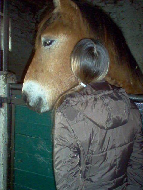 C'est le cucul de Théo, avec sa crinière et ma soeur qui lui fait un bisous |
