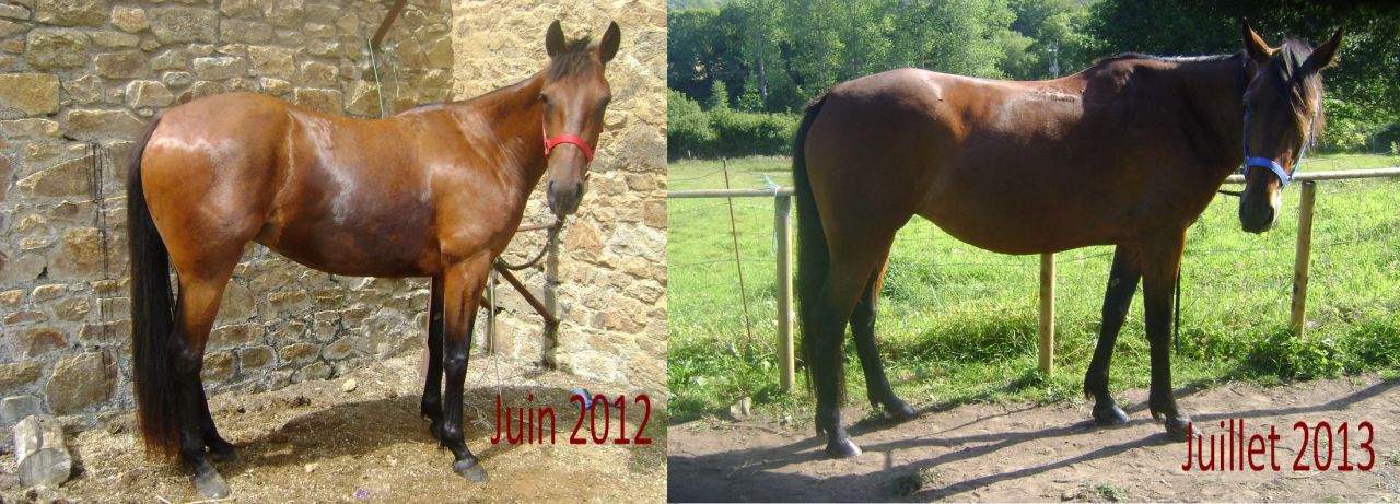 | Dire merci | Ventu ferrée des antérieurs depuis février 2013, ferrée des quatres avant. Ca ce passe pas trop mal aux postérieurs, un peu sensible au début mais ça va de mieux en mieux. Demain si j'ai le tps, petite sortie à la plage, avec la caméra GoPro sur la bombe Sinon petite évolution sur un an, pas flagrante (mise à part son ventre )![]() |