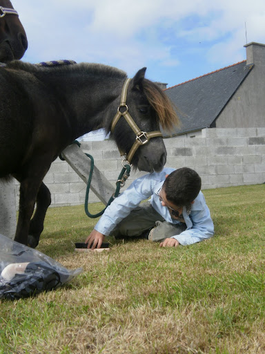 | Dire merci | Suite du boulot pour Végas avec une journée très chargée.......... séance brossage avec son futur cavalier. On remarque la violence du poney et les difficultés du "groom" |