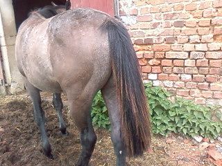 | Dire merci | Je parie qu'elle devient grise...sa mère était grise? ou son père? tu seras fixé d'ici quelques années, faudra modifier sa description! Ma jument avait une raie de mulet et un joli isabelle... actuellement elle est gris truitée, presque blanche (elle a 14 ans). |