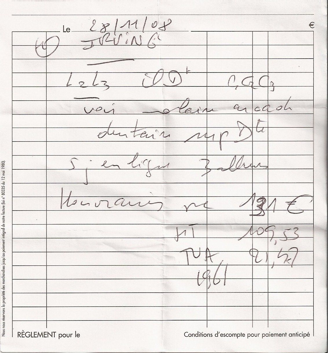 | Dire merci | moi je dirai : "latz ilDt CGcz voir olaire or caoli du terin nup Dte sj en ligne 3 allures ____ (la barre qui ne sert à rien sur l'ordonnance, mais ça donne un style à l'écriture) Hocr oaris M 131 euros (ça bizarrement c'est très lisible, comme quoi...) on passe le prix HT et la TVA, et j'adore ce dernier truc : " l96l " alors ça c'est fort... J'espère avoir pu t'aider, j'y ai passé du temps et tout mon coeur! Par contre à mon avis c'est un gars de la CIA parce que ça c'est un message codé ou je ne m'appelle plus zuzue! Message édité le 28/05/09 à 00:00 |