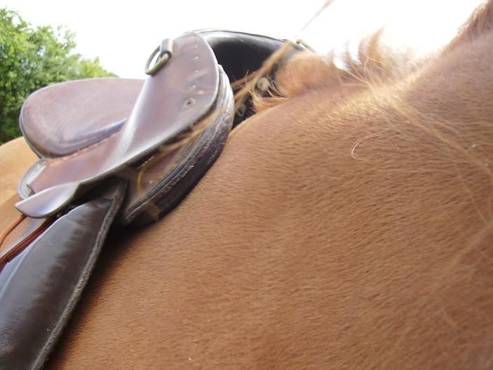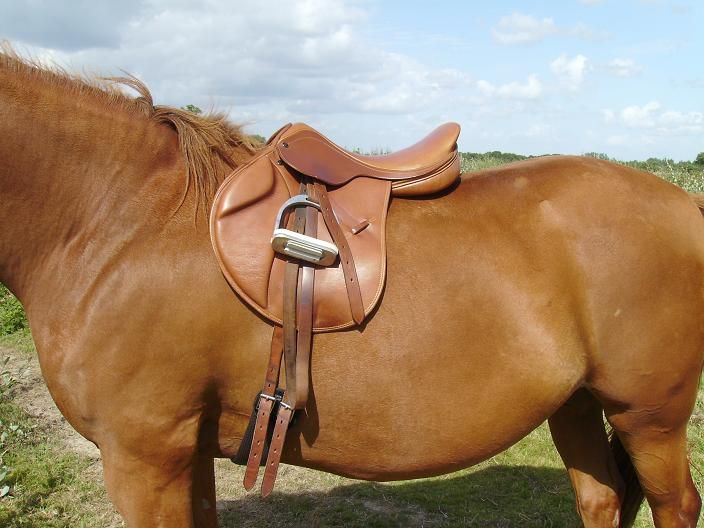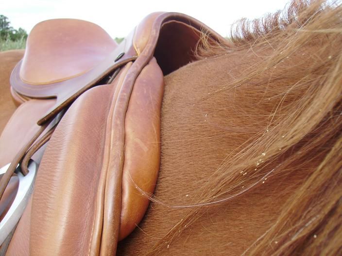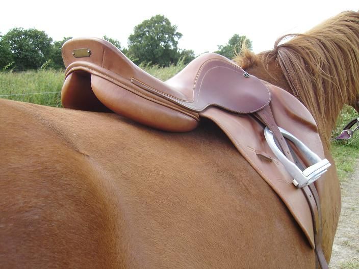 | pour être adaptée: - les matelassures avant vues de face sont entièrement en contact avec le cheval - 3 doigts minimum entre le pommeau et le garrot - vue de profil la selle ne doit pas faire toboggan vers l'avant (trop large) ou vers l'arrière (trop étroite) le pommeau et le troussequin doivent être au même niveau (sauf sur certaines selles de dress très creuses ça donne parfois une impression bizarre) - vue de derrière les matelassures doivent être en contact avec le dos, sur toute leur largeur. si ça avance, recule, ou tourne c'est qu'il y a souci niveau adaptation au cheval. et bien sûr les traces de transpi. |