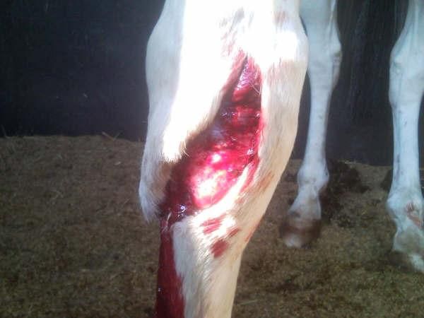 | Dire merci | mon cheval s'est ouvert le canon l'année dernière, profond jusqu'a l'os. c'etait beaucoup moins large (au niveau de la surface) mais bien profond. je peux te conseiller un pansemement désinfectant pour ce genre de plaie (par contre je ne sais pas a quel stade de la blessure tu pourras le mettre), ca s'appelle aluspray je crois; c'est un spray a l'aluminium qui évite de mettre un pansement et ca protège tout aussi bien (c'est si jamais il ne supporte pas le pansemement ou si il peut sortir un peu au paddock il vaut mieux mettre ca plutot qu'un pansement a proprement parlé, qui pourrait s'enlever a n'importe quel moment |