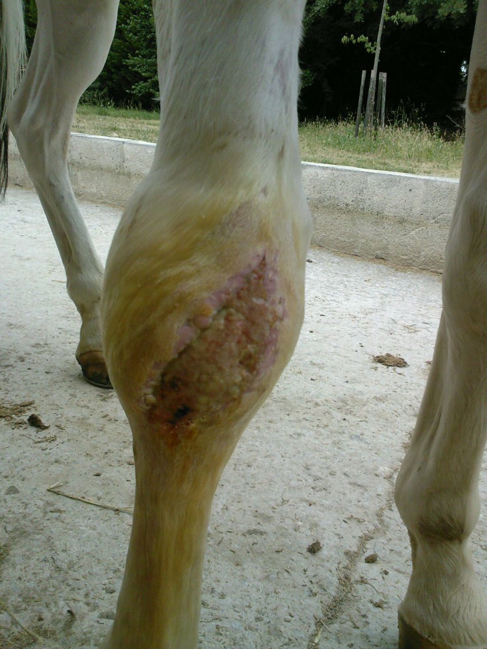 | Dire merci | je suis infirmière et j'ai une spécialisation sur les plaies . Mon cheval a eu la même blessure en 2001 mais en 2 fois moins grand mais on apercevait la capsule osseuse .donc +profond J'ai mis des plaques d'allevyn (cher mais bon ... ) que je changeais tous les 2 jours6 La plaie que je voie est encore trés fibrineuse un peu "sale" , il faut attendre un peu . remets des phtos dans 4 ou 5 jours |