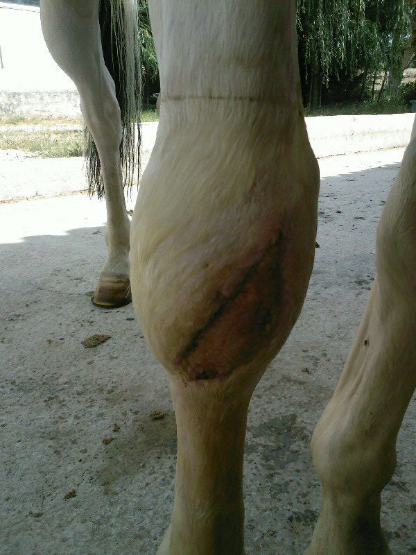 | Dire merci | merci pour ces compliments... ça nous encourage à poursuivre dans cette voie et à continuer les efforts ! c'est vrai qu'en un mois, la plaie est très belle et très propre alors on a l'espoir qu'il se rétablisse vite... par contre, on a pu constater 2 ou 3 fois que lorsqu'il marche tout va bien il ne boite pas, mais lorsqu'il fait un peu l'idiot à la longe et qu'il tente de se cabrer, son membre blessé ne le porte pas alors des radios vont etre necéssaires je pense ?? j'espère que ça ira... j'envoie des photos demain car là c'est ma cop qui y est allée aujourd'hui !! |