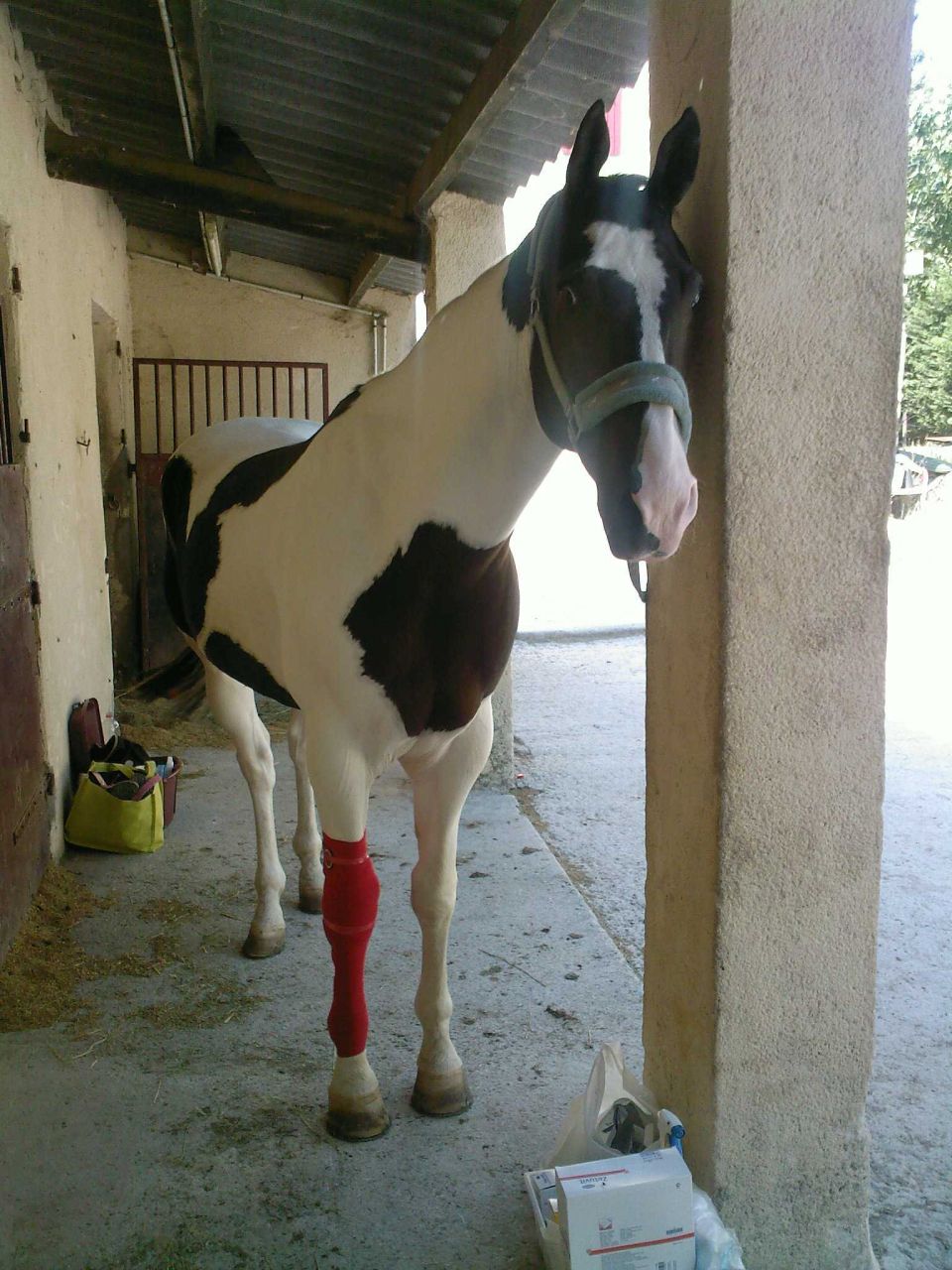 | Dire merci | c'est vrai que sur les photos il aime faire le malheureux !! il a l'air vraiment triste ce cheval !! lol... c'est surtout que dès qu'il me voir sortir l'appareil, il fait la tete !!! il déteste ça !! lol... en tt cas, aujourd'hui il était bien en forme et la blessure n'a pas changé...on y retourne mercredi alors j'espère que le pansement tiendra car il se l'enlève maintenant malgré tout ce qu'on fait pr le bloquer !!! dc aujourd'hui c'est rester à l'air car la palefrenière n'a pas eu d'autre choix que de tt enlever pr ne pas qu'il se prenne les pieds dans la bande...elle a mis de l'orospray dessus dc ça va, c'était bien protégé... enfin, je vous tiens au courant !!! |