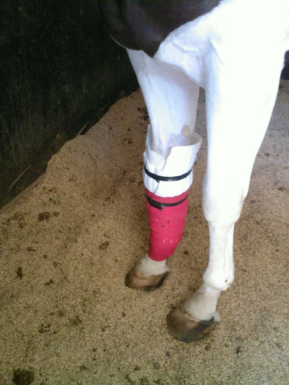 | Dire merci | OU alors , tu enveloppe le membre avec un jersey coton qu'on met normalement sous plâtre et elasto en haut et en bas ! je me souviens que j'avais fait dela sur mon cheval !!! attention à la plaie derrière qu'elle ne devienne pas escarre. OUI OUI le jersey c'est bien !!!! pas cher et t'en a +sieurs metres dans le rouleau . et ça tient bien |