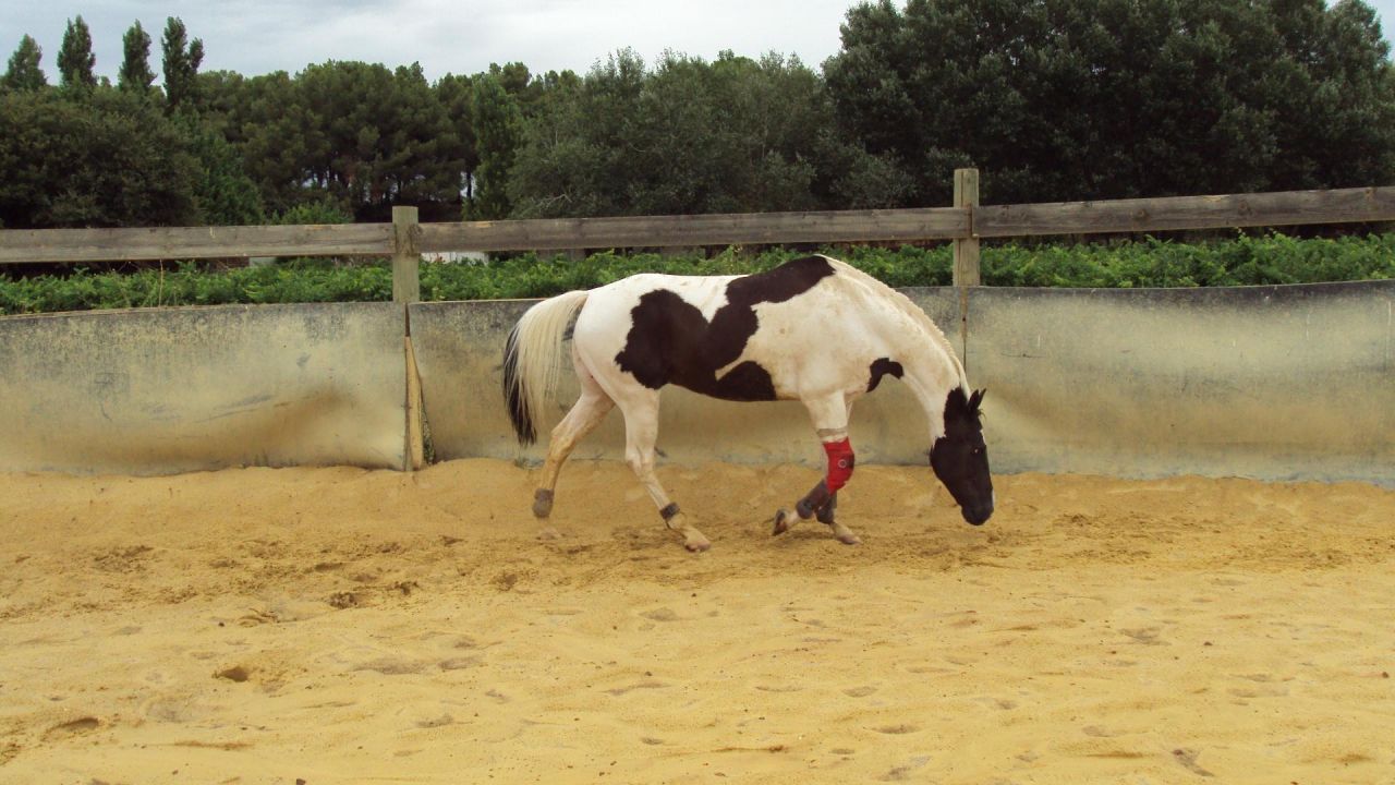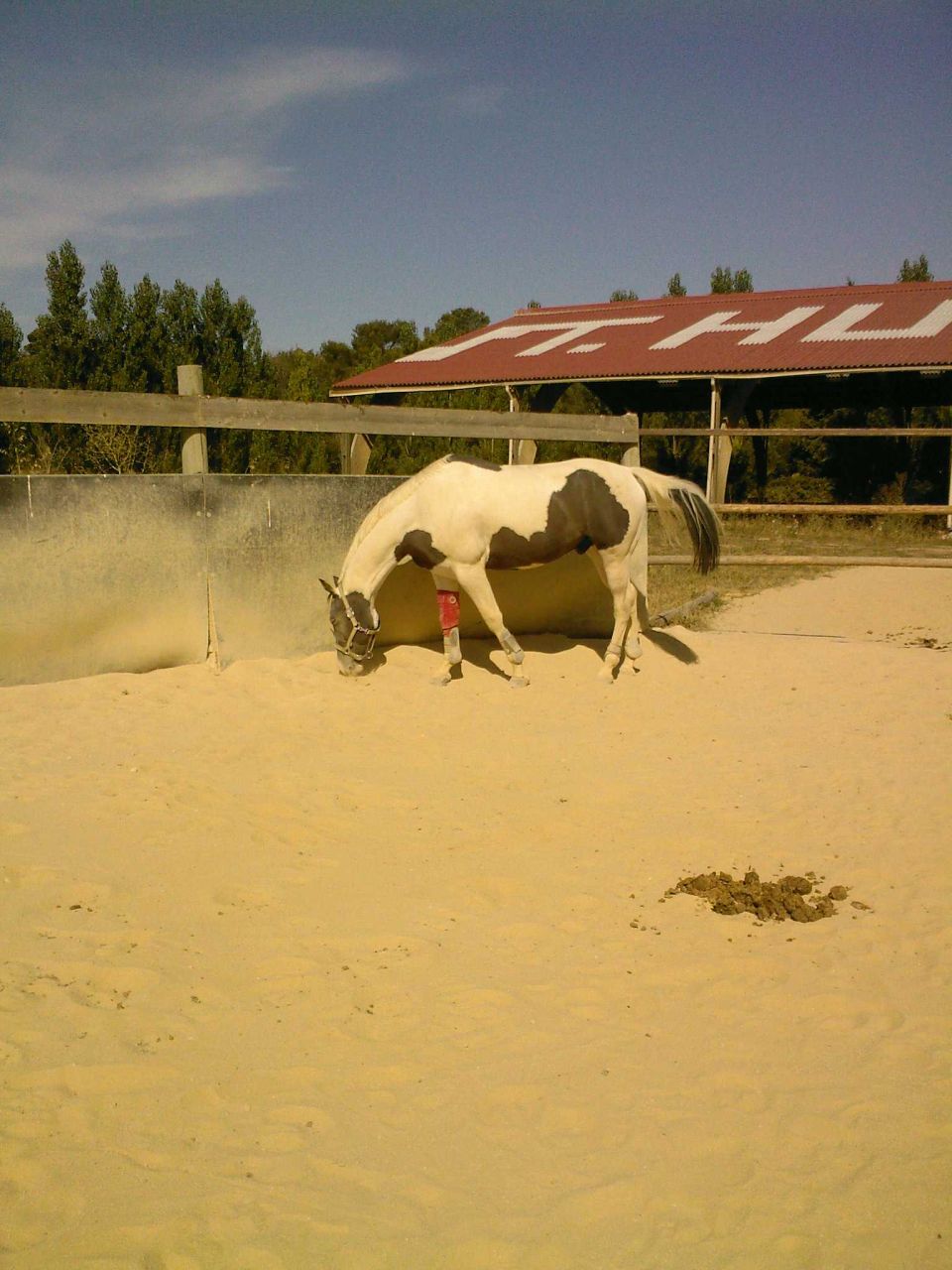 | Dire merci | j'ai oublié, au début on utilisait l'élastoplast pr bander le tout; mais ça "épile" trop le cheval et l'irrite alors je te le conseille pas... |