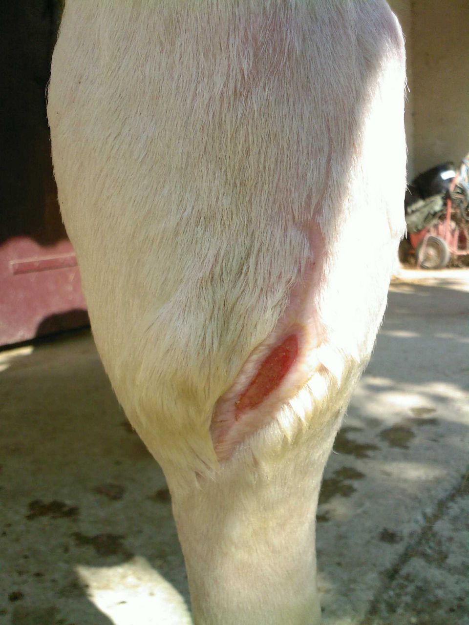 ) car en fait elle n'avait absolument pas été touché aux muscles ou quoi que ce soit, il y a juste la peau qui s'est arraché. Elle a fait les points de suture d'un côté de la plaie (vers l'arrière, laissant le devant ouvert. Si ça ne tient pas, faudra couper la peau qui pendouillera de nouveau.
