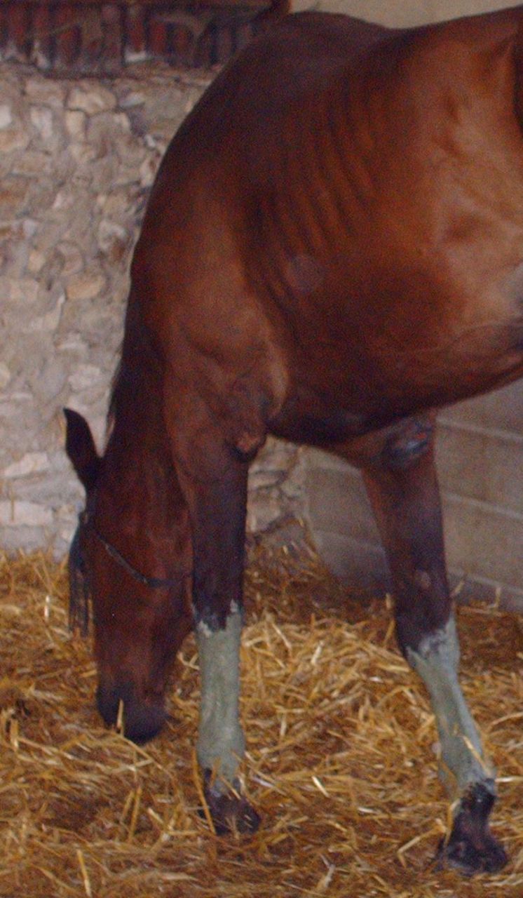 | Dire merci | Je viens tout de même d'en trouver une, où on voit les blessures des coudes, un mois après. On voit que ça ne guérit vraiment pas vite, il s'est blessé fin juin, la photo est du 31 juillet. [url=https://www.1cheval.com/membre/services/photos/images/47144.jpg] ![]() [/url] |