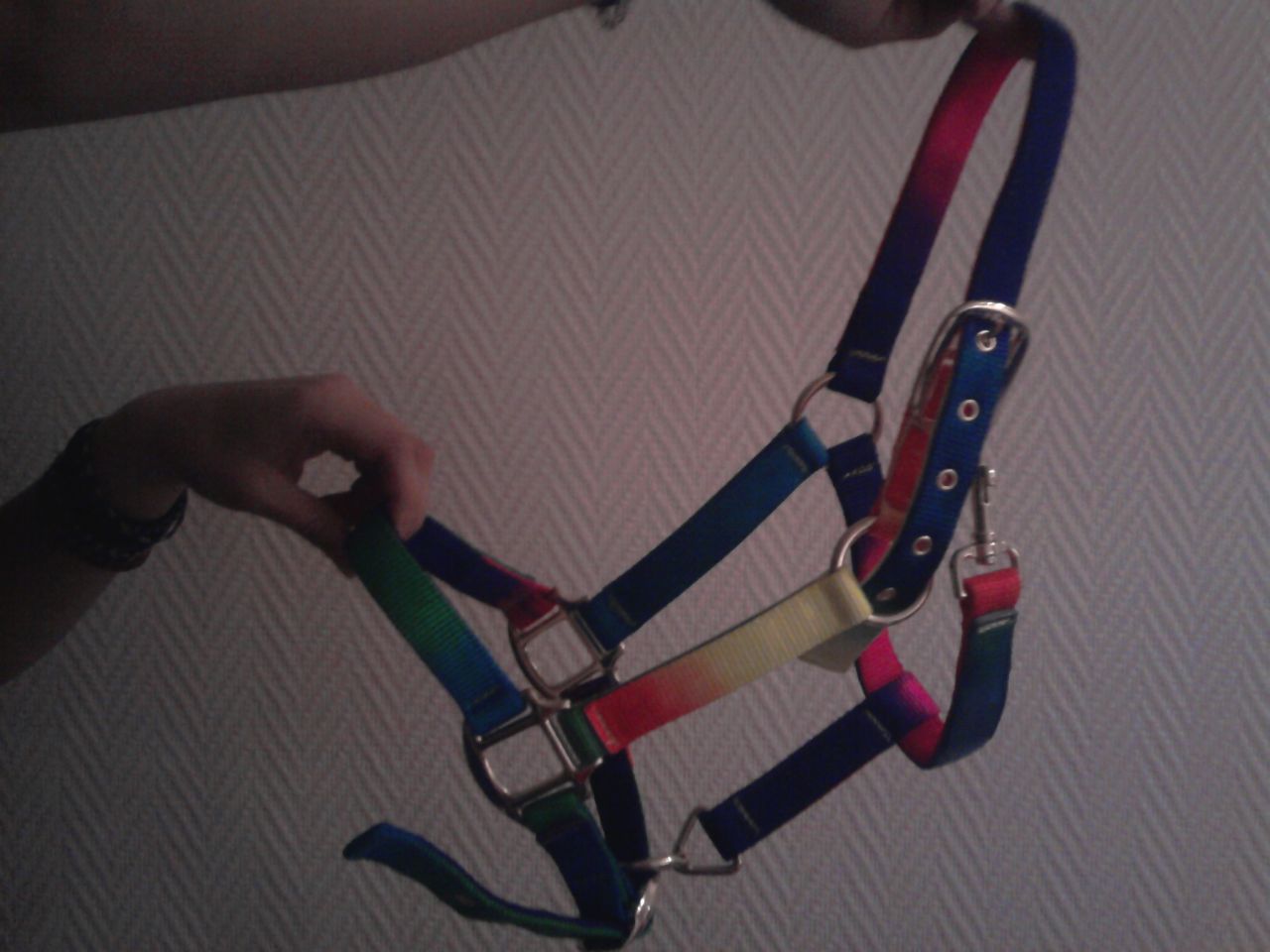 | Dire merci | Ouaouh vous avez tous une super collections de licol. Vakiraa j'adore le choco orange, j'aime beaucoup aussi cette combinaison de couleur que j'ai pour ma nouvelle juju. Mon merens a un licol violet, ma 1/2 arabe un licol prune (mais je compte lui en racheté un rose et gris), les 2 juments de mon homme une en vert lautre en bleu, notre comtoise en cuir, et on a aussi des licols marron, vert, bleu ... Mais bon pas hyper beaux car souvent ils sont cassés et réparer comme on peut c'est pas toujours joli lol |