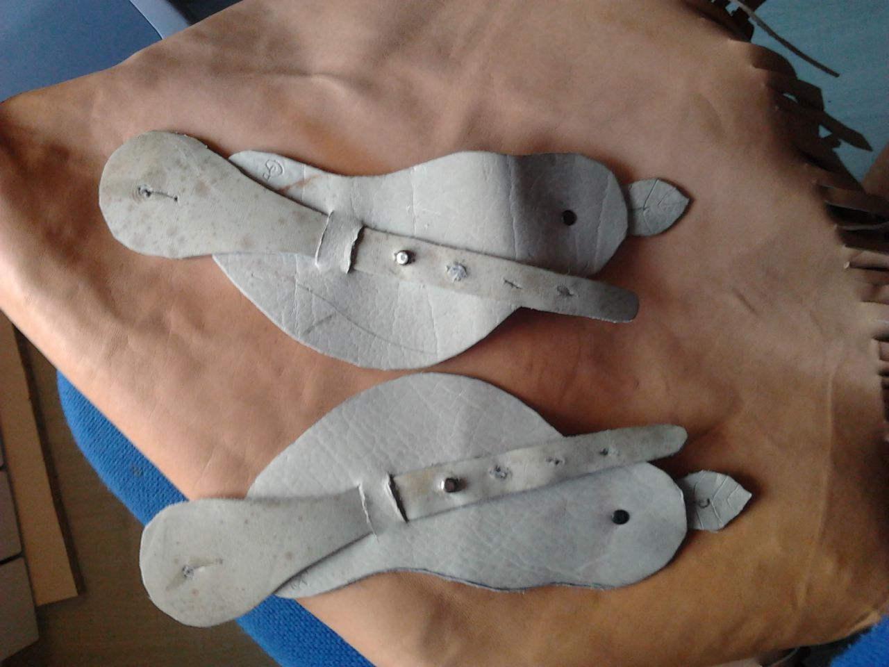| Dire merci | La suite de la selle: Fixation des points de sanglage,mise en place du siège (rembourré par deux couches de peaux d'agneau dessous): ![]() Vue du dessous: ![]() Aujourd'hui je fais les étrivières et la matelassure... A suivre!!!!! |