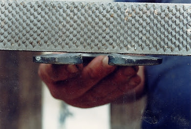 Déconnecté | tu peux imprimer les pages de mon blog sur les effets du pantouflage inverse : cela l'intéressera sûrement, et s'il déferre ce pied, tu peux vérifier avec lui en posant simplement une règle ou la râpe en travers du fer, comme sur mes photos. Vous vous rendrez compte tous les deux si les branches sont inclinées vers l'intérieur ou vers l'extérieur du sabot. Tant que le pied est ferré, c'est plus difficile à voir avec certitude. |