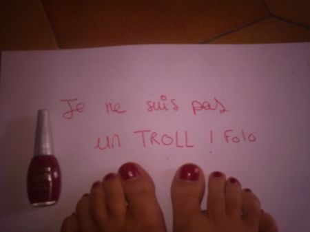 | Dire merci | Et moi....Je tape a 2 mains ![]() Quelle perte de temps, c'est pour ça que mes ongles de pieds sont si dégeux ![]() Ah non, ils sont magnifiques, c'est vrai, j'oubliais que je les avais mis en photo |