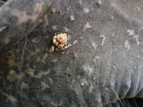 | Le mien en a aussi, 3 ans mais elles sont plus noires et plates. Il en a 4. J'ai mis du tuya...le véto disait que cetait pasmal...au bout d'un moi rien...la je met de la teinture d'iode...ca brule un peu et je complète par une pierre rouge de magnésium...bof boF jattends... |