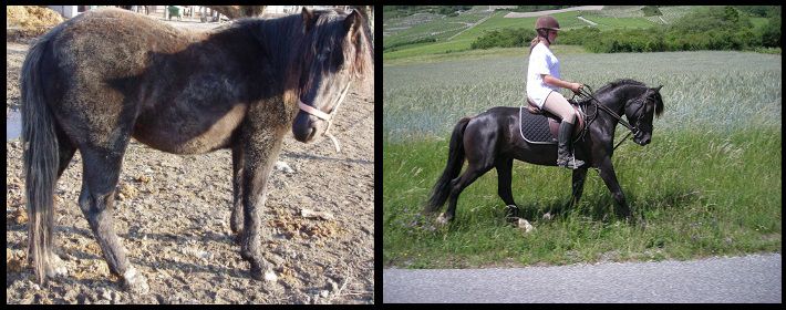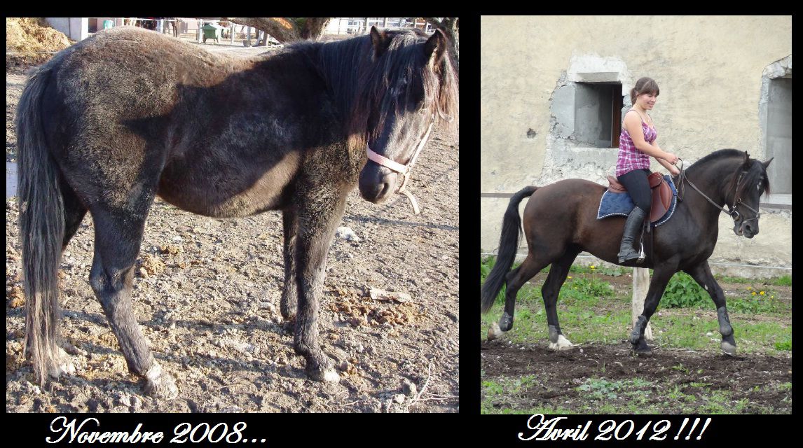 | Dire merci | Mayoral Avant: Physiquement: Maigre ( - 100kilos ) Pas musclé Crins terne Robe bai au lieu de noir Psyco: Mordait Bottait Chargé Coup de cul quand je le montais Tic a l'appui Dépressif Pas d'appétit Et encore... 4ans après: Physiquement: Gros ( presque gras ) Musclé Noir pangaré Poils et crins brillant Psyco: Mors plus, botte plus Charge de rarement Plus de coup de cul pour moi, que pour les autres A reduit le tic a l'appui Vif Mange plus que tous Monté avec filet sans mors et sans rien Belle avancé !!! Je cherche des photos d'avant |